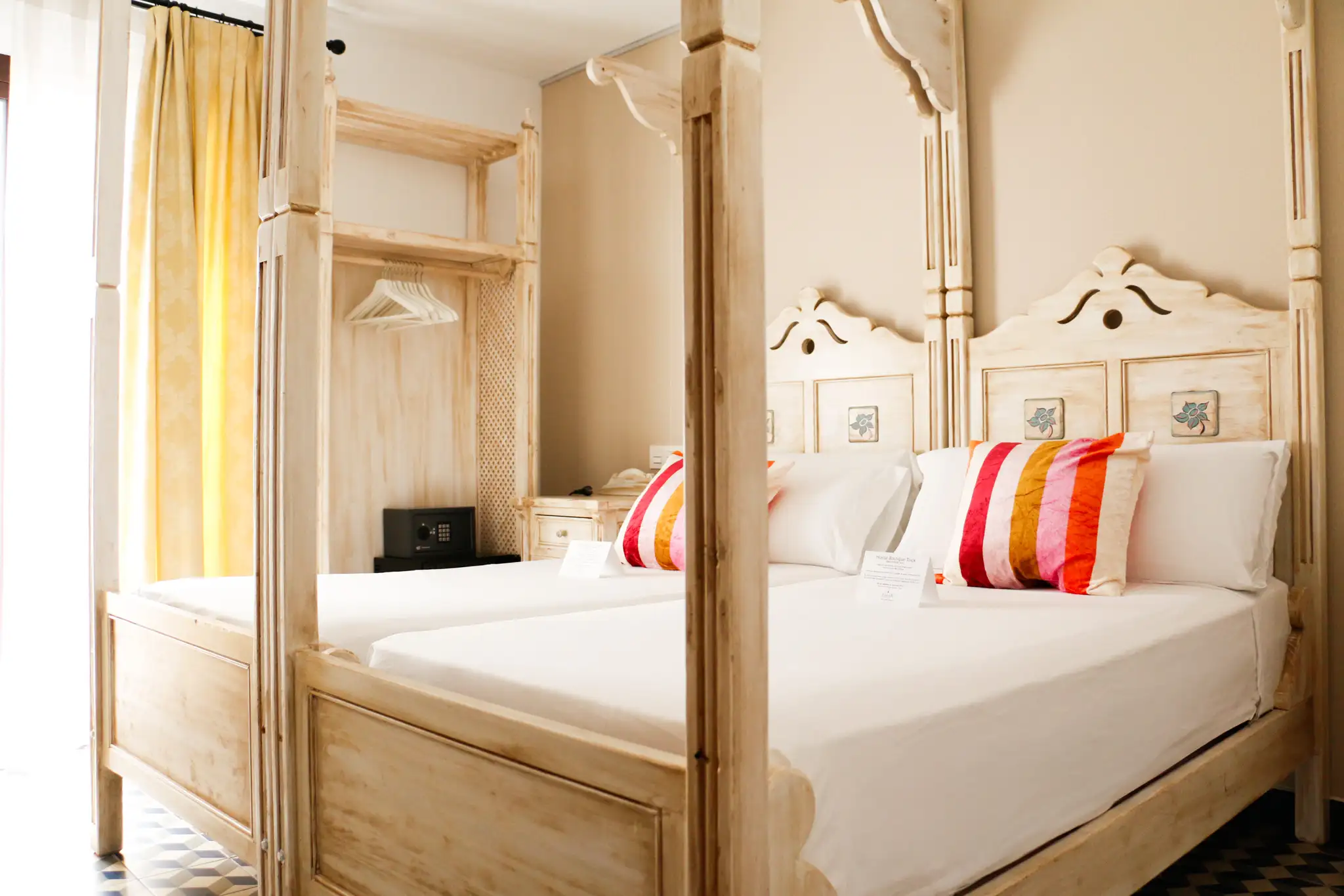Nuestra habitación doble es la opción perfecta para parejas o dos personas que desean disfrutar de un descanso reparador en un entorno tranquilo y acogedor. Con una decoración de estilo rural moderno, ofrece camas individuales de 90 cm, armario, caja fuerte, minibar de cortesía, aire acondicionado, calefacción, conexión Wi-Fi gratuita y televisión de pantalla plana. El baño privado incluye ducha y amenities disponibles en recepción. Dispone de ventana o balcón con vistas al patio o a la calle.